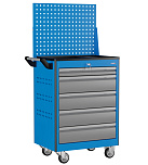 5 ящиков. Для хранения инструмента в ЕВРОЛОЖЕМЕНТАХ. Боковые панели с перфорацией (для установки аксессуаров). Цельносварная конструкция корпуса тележки. Центральный замок Euro-Lock. Шариковые направляющие полного выдвижения. Размеры (высота x ширина x глубина): 850 х 700 х 460 мм. Вес: 55 кг.