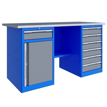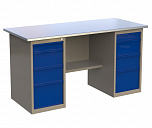 Верстак двухтумбовый поставляется в разобранном виде (4 элемента). Нагрузка на столешницу до 600 кг. Стандартный цвет: корпус - серый глянец RAL 7030, ящики и двери тумб - синий RAL 5017. Размеры:855x1400x700 мм. Масса: 107 кг.