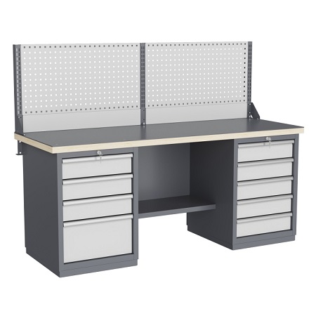 Двухтумбовый. Допустимая нагрузка на столешницу 1000 кг. Опорные элементы выполнены сварными из холоднокатаной стали. Для выполнения сборочных, ремонтных, слесарных, монтажных и других видов работ на производстве, в сервисных центрах, мастерских, гаражах, а также для обучения технологии в учебных заведениях. Комплектуется полкой-стенкой, расположенной под столешницей для удобного размещения габаритного инструмента и оснастки. Размеры верстака: 855x1796x696 мм. Вес: 133 кг. Поставляется в 4 комплектациях на выбор.