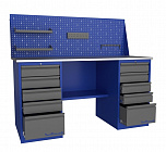 Двухтумбовый. Допустимая нагрузка на столешницу 1000 кг. Опорные элементы выполнены сварными из холоднокатаной стали. Для выполнения сборочных, ремонтных, слесарных, монтажных и других видов работ на производстве, в сервисных центрах, мастерских, гаражах, а также для обучения технологии в учебных заведениях. Комплектуется полкой-стенкой, расположенной под столешницей для удобного размещения габаритного инструмента и оснастки. Размеры верстака: 855x1596x696 мм. Вес: 107 кг. Поставляется в 4 комплектациях на выбор.