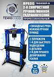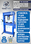 Усилие 50 тонн. Пресс гидравлический. Привод: ручной. Две скорости подачи пуансона. Первая скорость для быстрой подачи штока к рабочей поверхности, вторая (медленно) для выпрессовки. Применяется для запрессовки подшипников, деталей машин и механизмов в гаражах, автосервисах и СТО.