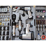 Полный набор пневмоинструмента слесарный – 71предмет. Гайковерт слесарный 320Nm, для болтов 11-19мм. угловой гайковерт 68Nm”, зачистная машинка 22000 об/мин, пневмозубило с набором зубил, продувочный пистолет, набор бит, набор ударных головок, набор быстросъемов, набор шарошек, набор абразивных наконечников, переходники и масло.