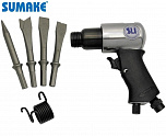 Компактный и мощный инструмент. Корпус выполнен из легкого и прочного алюминиевого сплава. Для выполнения ударных, режущих и рубящих работ или удаления заклепок, снятия слоя старого покрытия. При длине 130 мм частота ударов молотка составляет 4300 уд/мин. Рабочий ход составляет 43 мм. В комплект поставки входят 2 стальных зубила.
