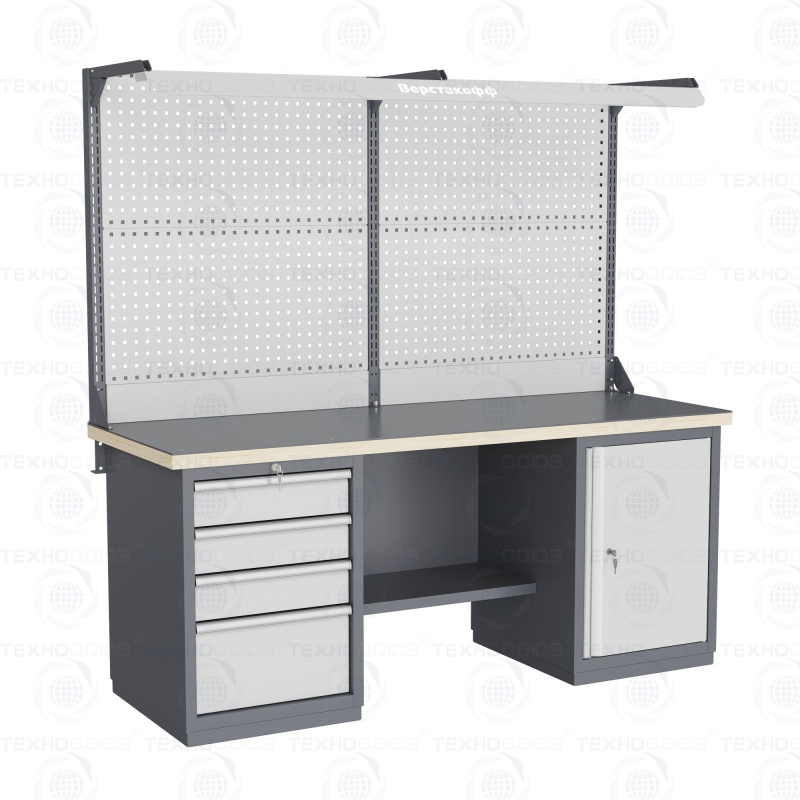 Верстак может комплектоваться одинарным или двойным перфорированным экраном, электромонтажным блоком для установки розеток и дополнительных устройств, а также комплектом освещения с держателем и лампой. Перфорация экрана подходит под стандартные держатели для инструментов, отверток, крючков, полок. Возможна комплектование верстака навесным элементами (держатели, крючки, полки).
