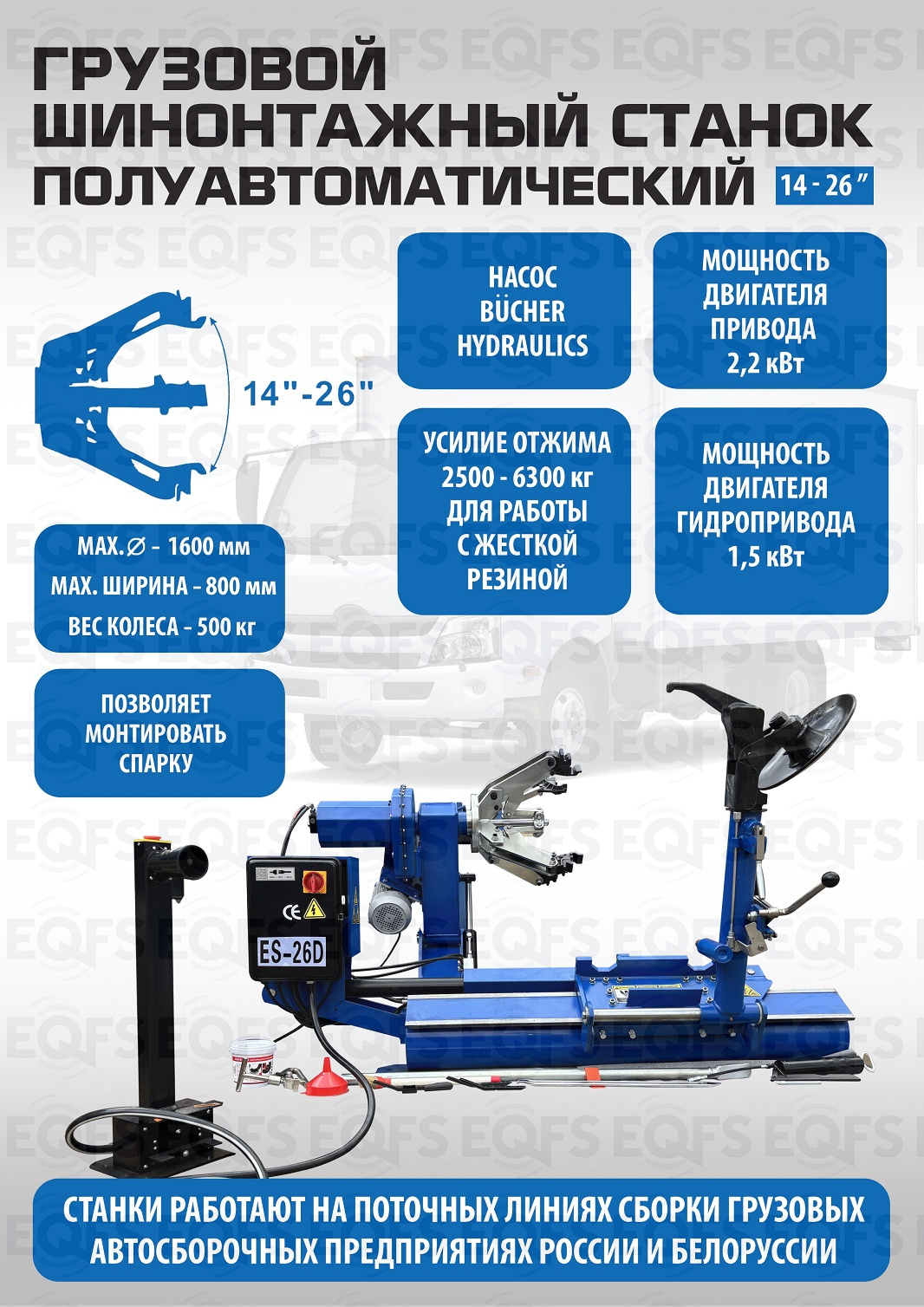 Комплект состоит из ES-26D Шиномонтажного станка c немецким гидронасосом. Очень качественный станок. Отказов и рекламаций нет!!! Диски сталь, AL, с кольцами и без, 14÷26” с адаптерами 14÷42”, Колесо макс. Ø1600 ширина 780мм, до 500кг. Моторы 1,5 + 2,2кВт. Гарантия до 18мес. + ES-850 Балансировочный станок для балансировки колес легковых и грузовых автомобилей. Колесо «в сборе» Ø до 1200 мм, вес до 150 кг. Диски Ø 13-24” ширина 1,5-20”, подключение 380 В. Встроенный пневмоподъемник. Гарантия до 18 мес.