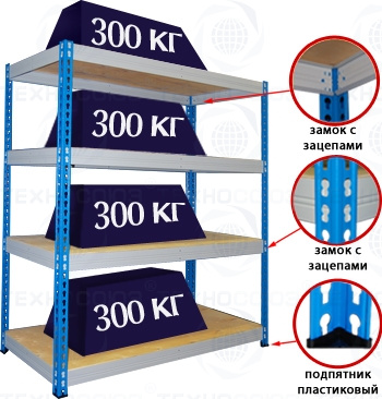 Полками служит настил из фанеры толщиной 10 мм (серии ФК-10). Стеллаж поставляется в разобранном виде. Балки и стойки упакованы с помощью стрейч пленки.