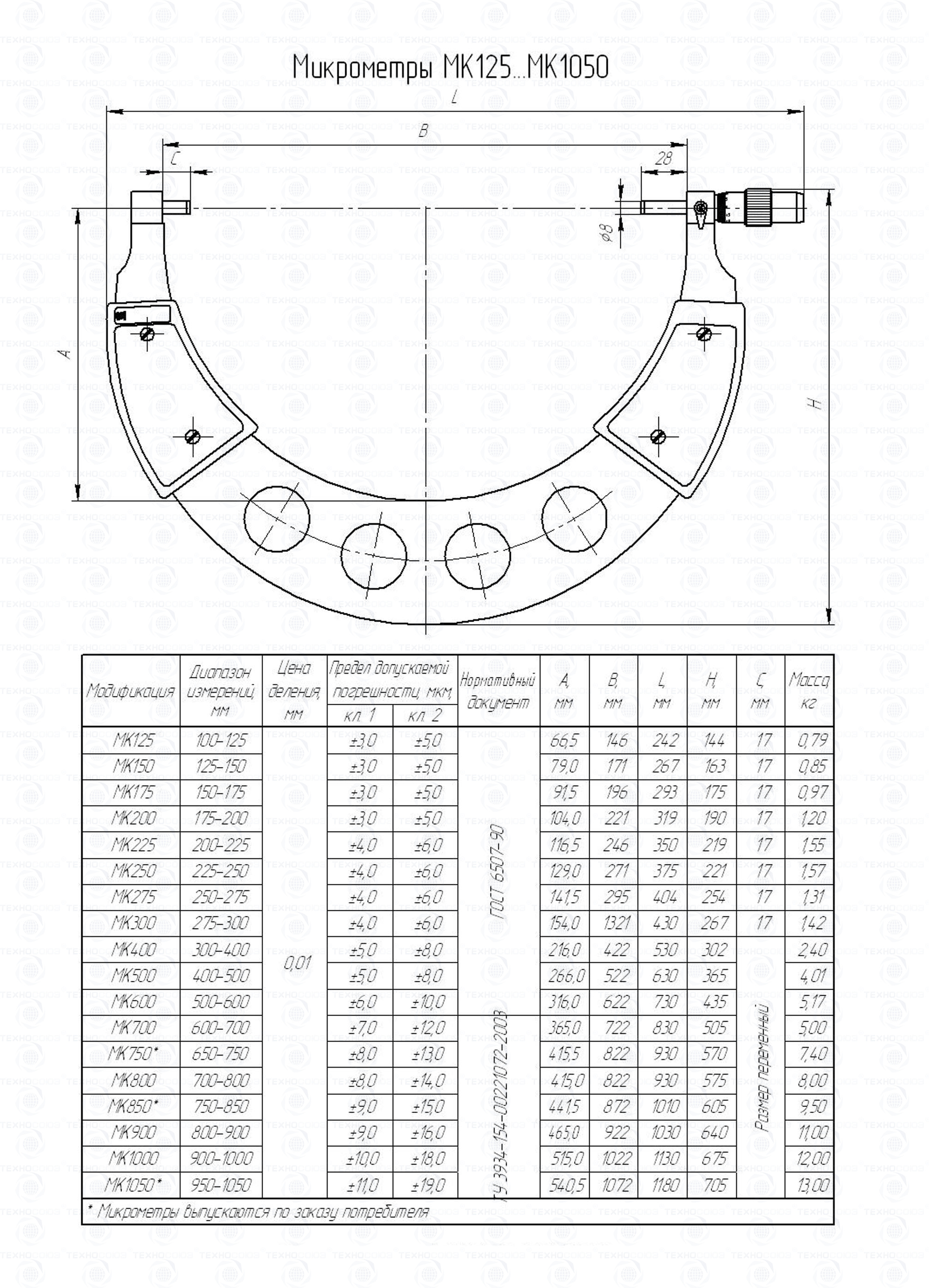 Цена деления 0,01 мм. Диапазон измерения от 100-125 мм. Для измерения наружных размеров изделий. Измерительные поверхности микрометра оснащены твердым сплавом. Микрометры укомплектованы одной установочной мерой. Класса точности 2. ГОСТ 6507-90. Поставляется в двух вариантах с поверкой и без поверки!