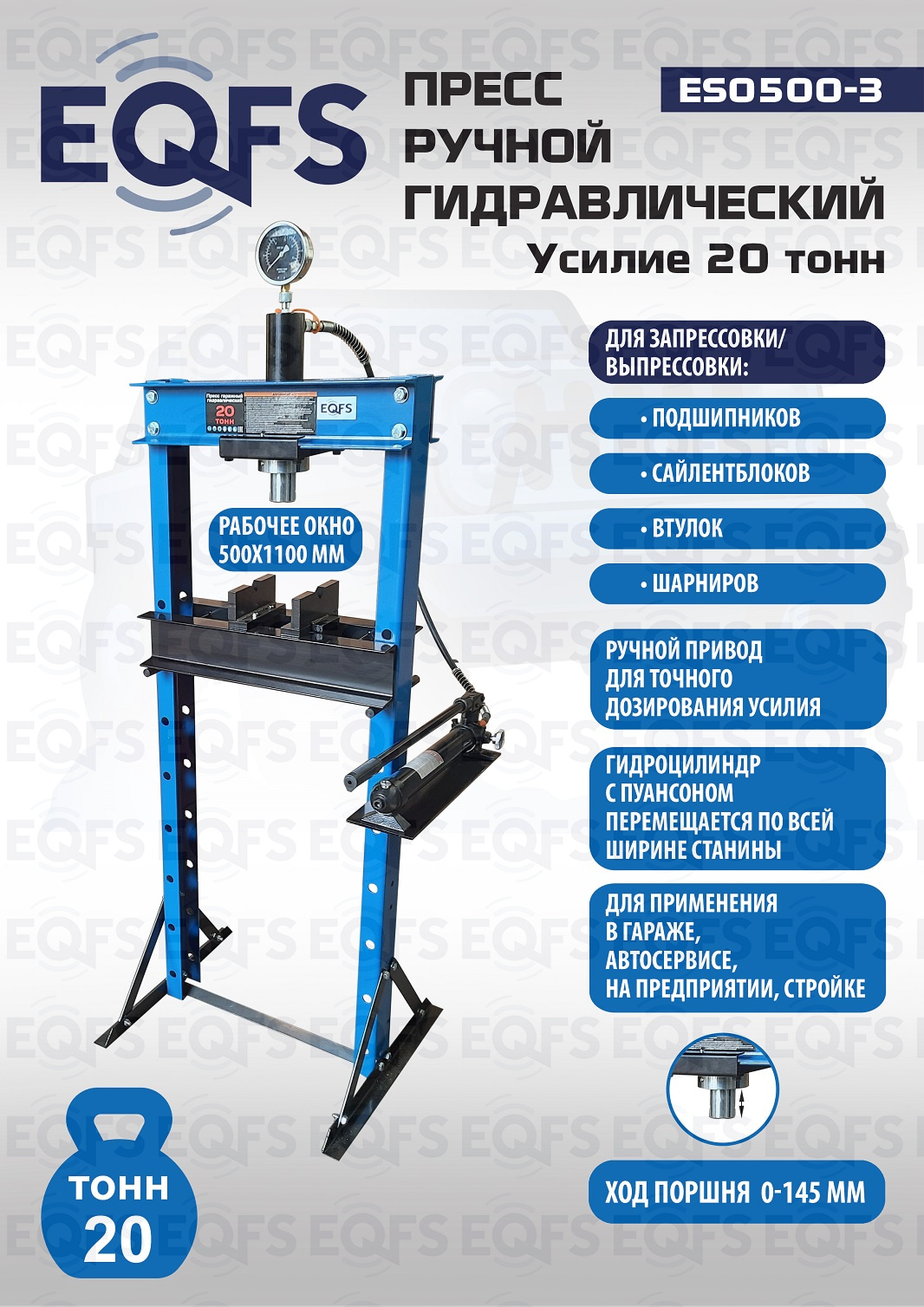 · Пресс укомплектован гидравлическим ручным насосом с максимальным усилием 20т.