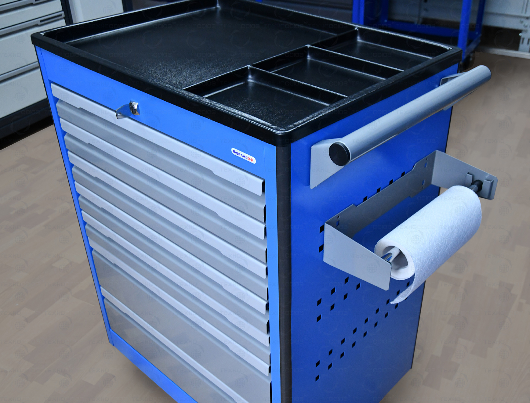Тележка снабжена центральным замком с поворотом ригеля 180 градусов, который закрывает одновременно все ящики. Замок неподвижно и прочно закреплен на корпусе тележки. В комплекте имеется два ключа. Тяга замка подпружинена.