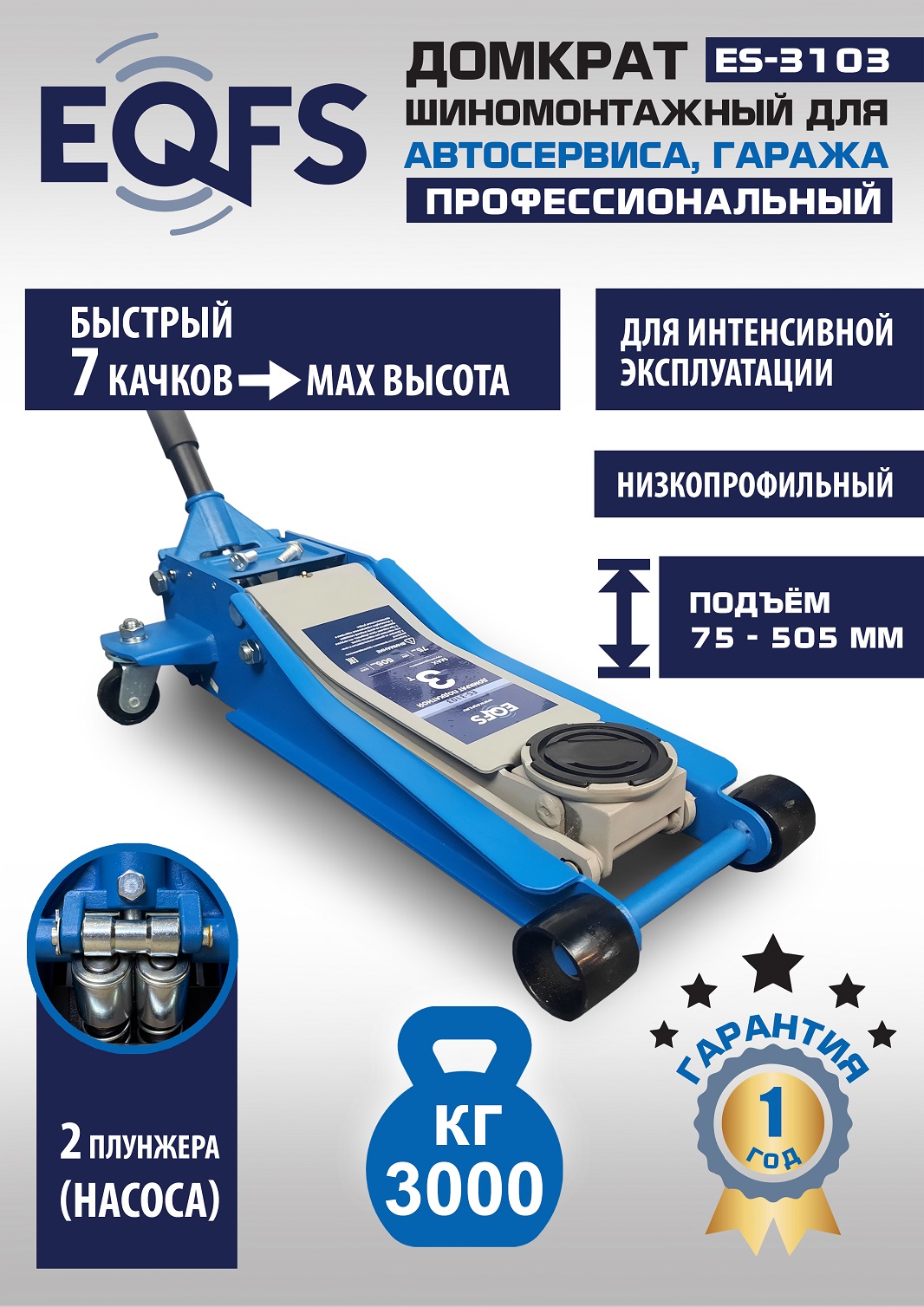 ES-3103 Домкрат подкатной низкопрофильный 3т. (2 шт.)  Гарантия 1 год. Профессиональный. Для интенсивной эксплуатации. 7 качков для поднятия на макс высоту. Подкатной. Низкопрофильный. Двухштоковый механизм. Усиленная конструкция. Быстрый подъем. Имеет повышенную износостойкость. Поворотная ручка, тавотница, лоток для хранения и резиновая накладка на чашку домкрата в комплекте. Грузоподъемность 3 тонны с усиленными ребрами жесткости.  Высота подъема мин / макс - 75-505 мм. ВЕС - 34,5 кг.