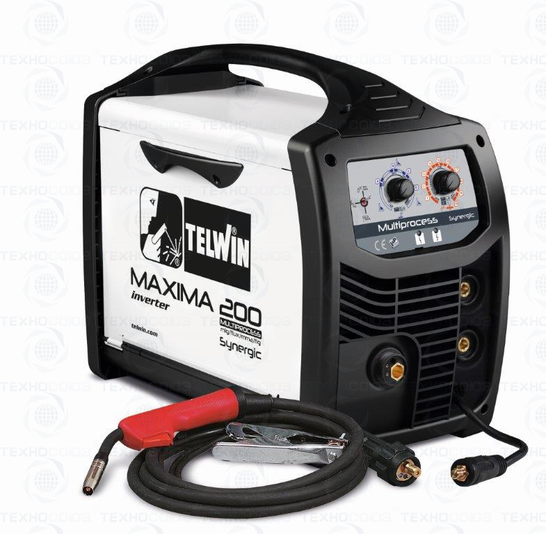 Диапазон сварочного тока 20-170А. Мощность 3,2 кВт.  Сварочный полуавтомат MAXIMA 200 SYNERGIC 230V – предназначен специально для сварки MIG/MAG углеродистой стали или низколегированной стали в среде защитного газа CO2 или смеси аргона/CO2, используя цельную электродную проволоку также для сварки TIG постоянным током (DC), с возбуждением дуги касанием (режим LIFT ARC) + для сварки электродом MMA постоянным током. 2 года гарантии. Сделано в ИТАЛИИ.