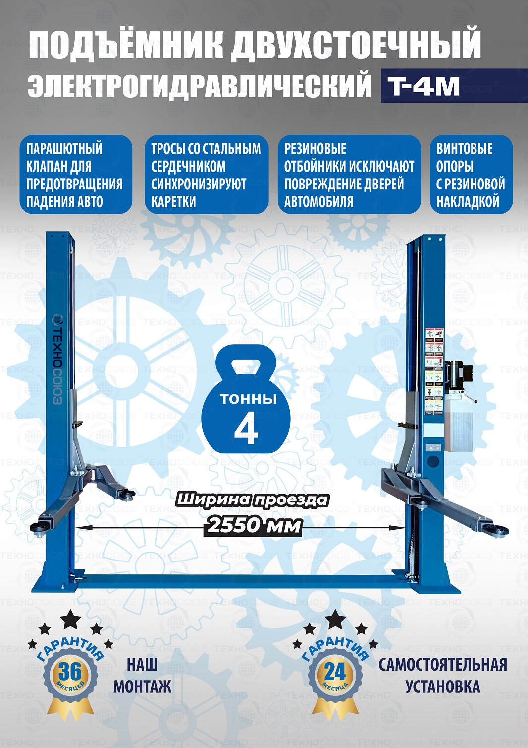 Гарантия 36 мес – наш монтаж, 24 мес – самостоятельная установка. Срок службы – не ограничен. Поднимает ВСЁ – от «Оки» до «LC200». Съем со стопоров – ручной. Тросом на каждой колонне. Передние лапы изогнутые (715-1041 мм) складываются по ходу движения авто, задние лапы (905-1451 мм)  - не нужно прокатывать вперёд/назад. Мотор 2,2кВт. 220/380В. Высота подъёма 110÷1930 мм. г/п - 4 тонны.