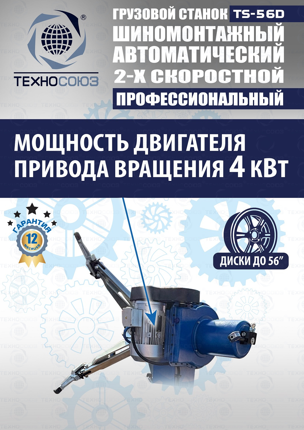 Двухскоростной грузовой шиномонтажный станок автоматический предназначен для шиномонтажных работ с колёсами автобусов, тракторов, строительной техники с диском 14-56”. Максимальный диаметр колеса 2500 мм, позволяет делать колеса "спарку" с шириной диска до 1200 мм. Максимальный вес до 2000кг. У данной модели: привод 4000 Вт, мотор гидронасоса 4000 Вт - может работать с жесткой резиной!!! Отжим min-max. 1 скорость - 4900-11302Н/м. 2 скорость - 3300-9300Н/м.