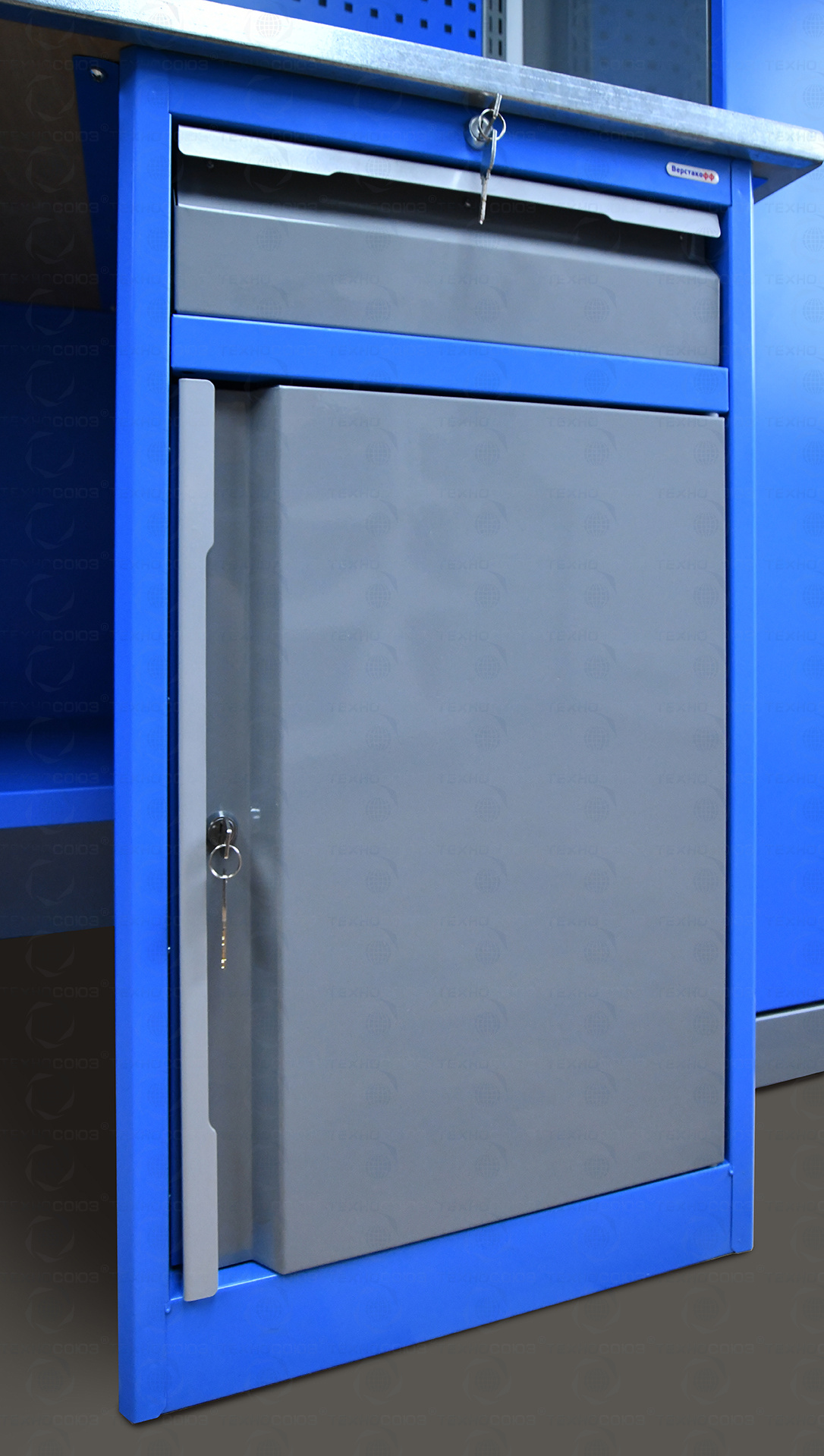 Тумбы верстаков выполнены сварными. В тумбе P7 установлено две полки. Полки устанавливаются на парах специальных формованных зацепов, выполненных в боковых стенках тумбы. Имеется возможность смены стороны открывания двери. Дверь тумбы снабжена центральным замком с поворотом ригеля 180 градусов. В тумбе P8 установлен малый ящик и имеется отделение с дверью и одной полкой. Внутренние размеры малых ящиков (ВхШхГ), не более: 103 х 397 х 520 мм. Ящик снабжен центральным замком с поворотом ригеля 180 градусов и подпружиненной тягой. Полка устанавливается на парах специальных формованных зацепов, выполненных в боковых стенках тумбы. Имеется возможность смены стороны открывания двери. Дверь тумбы снабжена центральным замком с поворотом ригеля 180 градусов. В комплекте имеется два ключа с каждым замком.